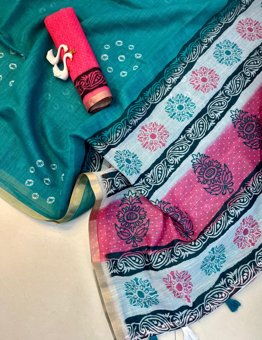 Soft pure chanderi cotton saree with allover hand dyed bhandani designs perfectly designed with hand – Block print pallu.