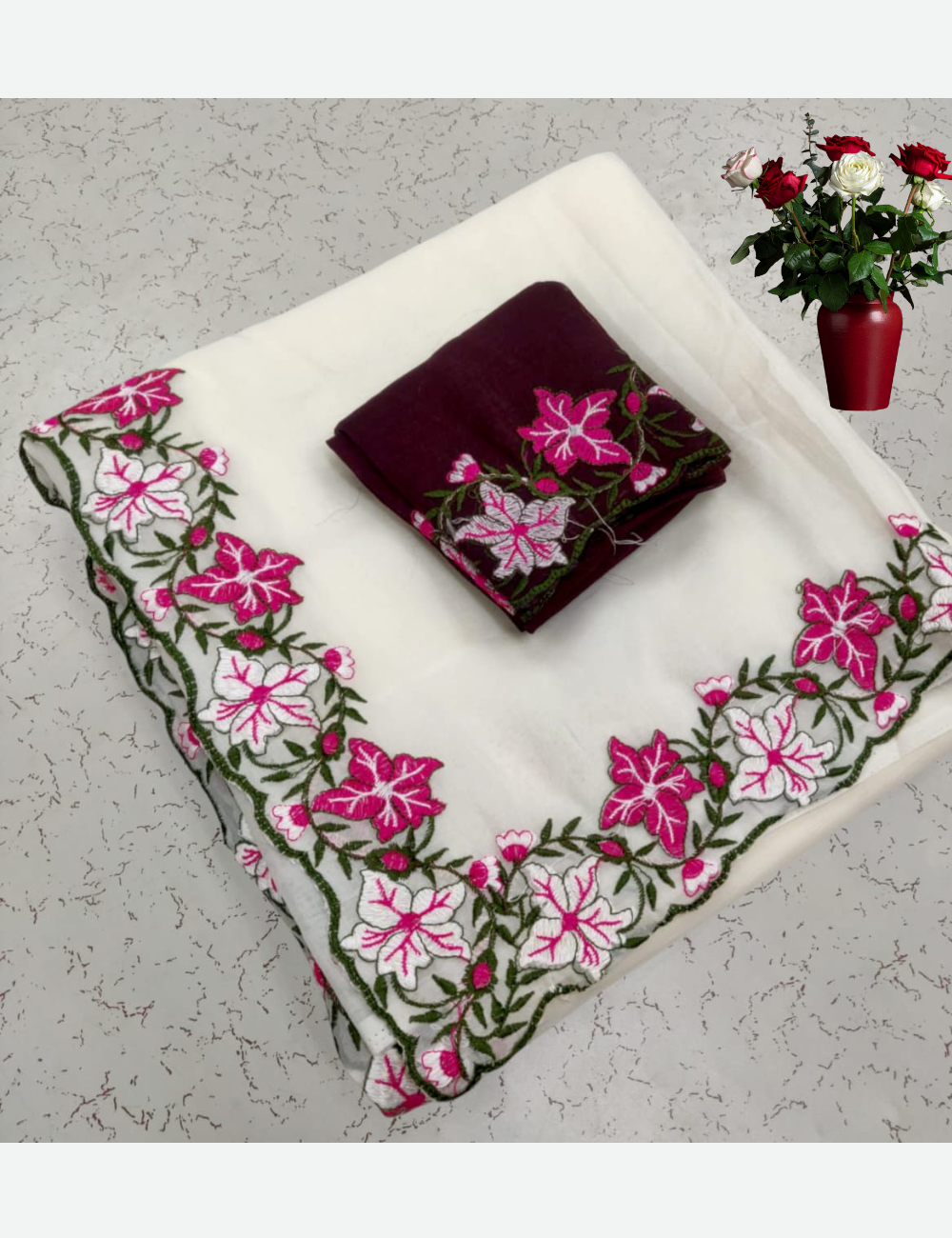Fabric – soft crunchy crush chiffon saree with beautiful embroidery butti & moti work cut work border