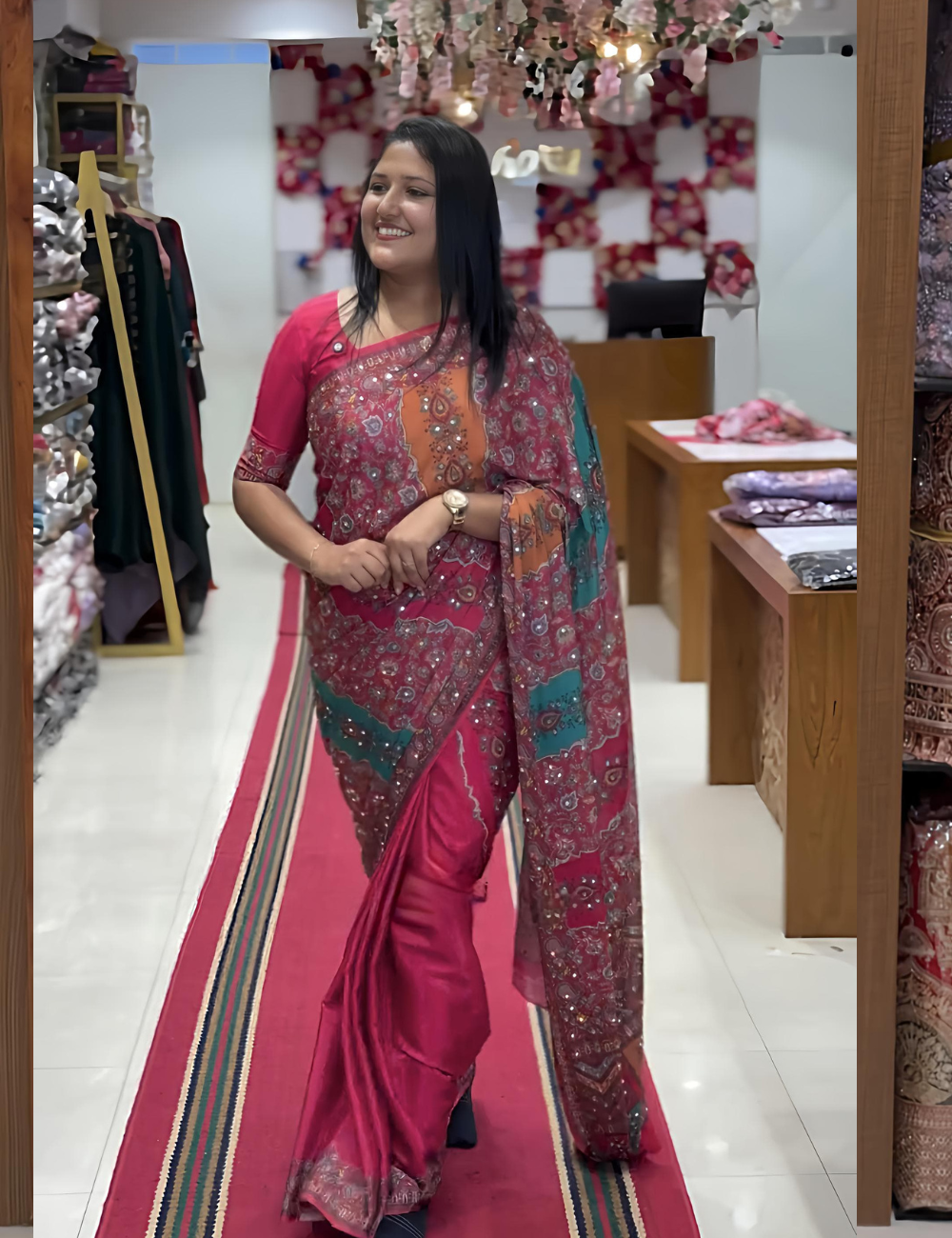Heavy Marsh mellow georgette saree with mosaic digital print and mirror work(2500 unit) all over sarees attached with perfectly matched pallu & blouse piece