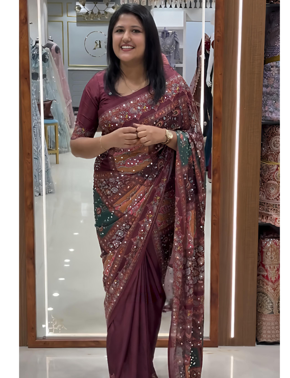 Heavy Marsh mellow georgette saree with mosaic digital print and mirror work(2500 unit) all over sarees attached with perfectly matched pallu & blouse piece
