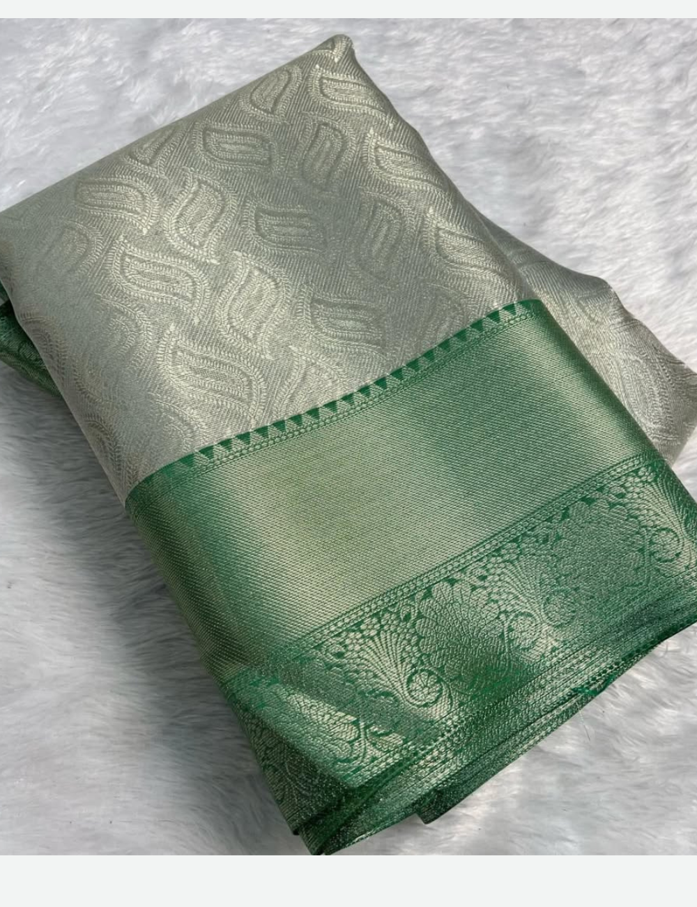 Party wear semi Tissue silk Sarees In Half white with Green Border