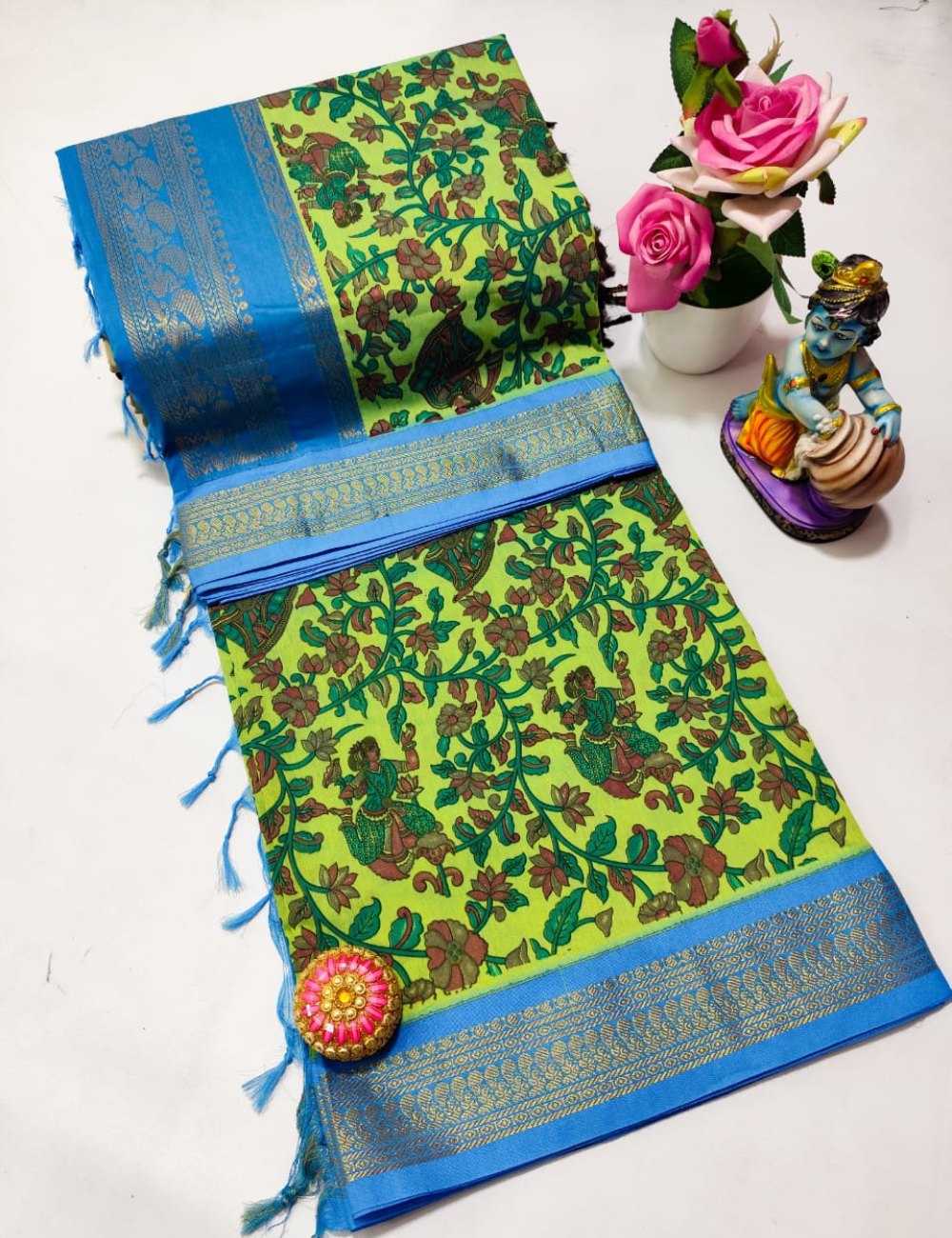 Kalyani cotton is a soft, breathable cotton blend, often mixed with silk or polyester threads to enhance durability and give a mild shine. The fabric is lightweight and airy, perfect for all-day wear, especially in warm climates.