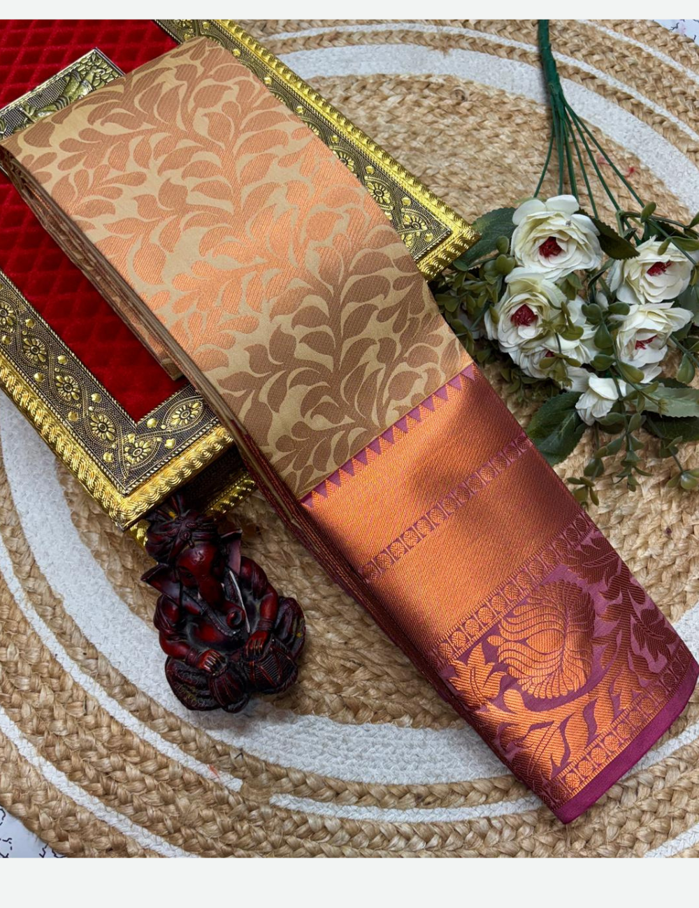 The drape is lightweight yet grand, adorned with delicate zari borders and a subtle sheen that catches the light with every movement. Perfect for festive occasions, weddings, or cultural celebrations, this saree is a statement of bold grace and timeless elegance.