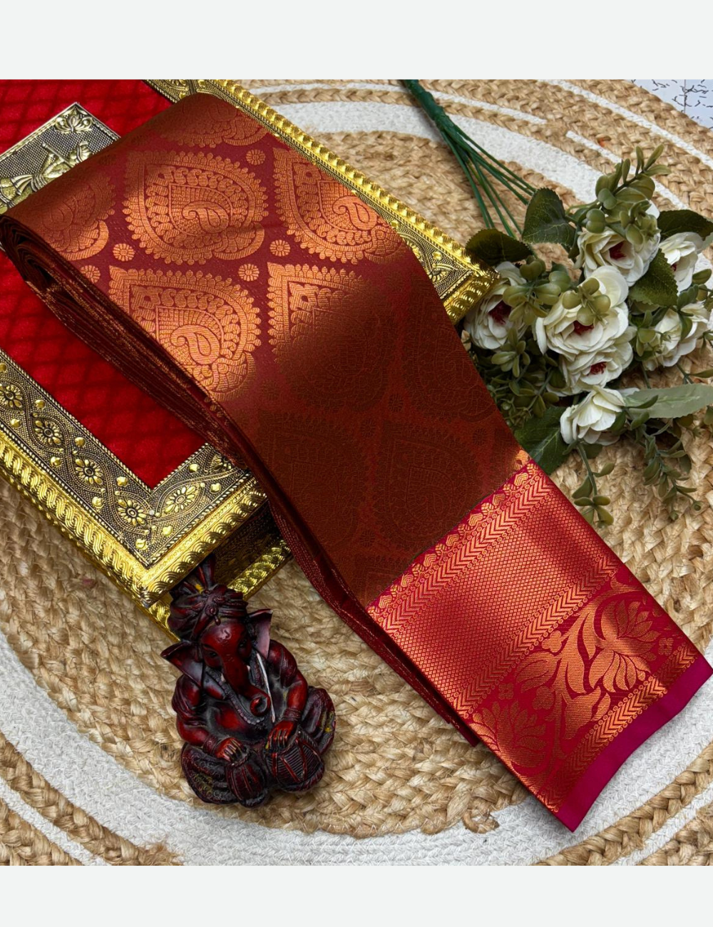 The drape is lightweight yet grand, adorned with delicate zari borders and a subtle sheen that catches the light with every movement. Perfect for festive occasions, weddings, or cultural celebrations, this saree is a statement of bold grace and timeless elegance.